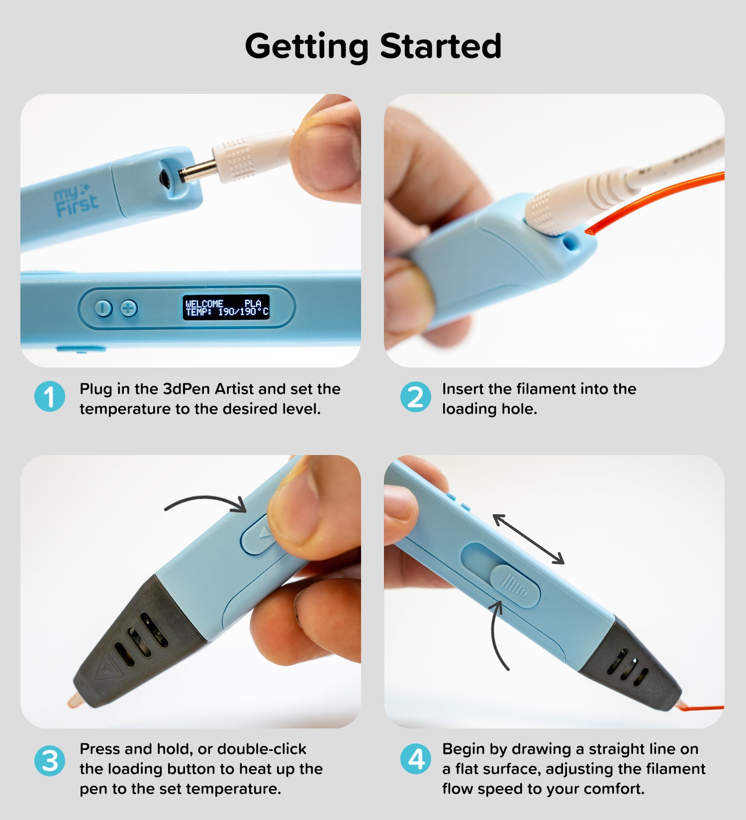 The myFirst 3dPen Artist uses PLA filament, a safe and biodegradable plastic commonly used in 3D printing. Compared to other filaments used in 3D printing, PLA melts at a lower temperature. This makes it ideal for 3D pens, as the pen itself doesn't need to get extremely hot.