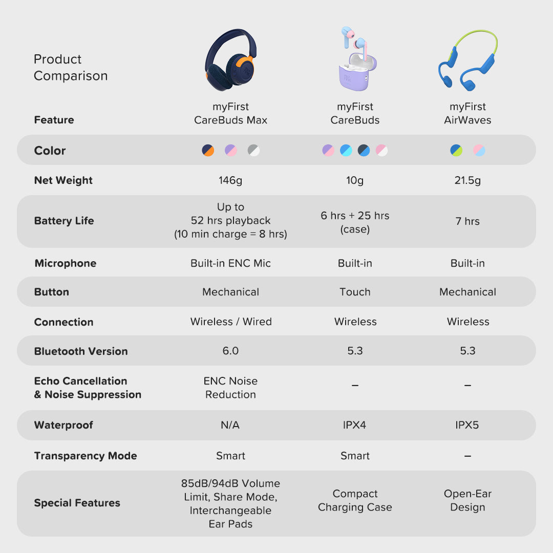 Let your child experience safe, crystal-clear sound with the myFirst Carebuds Max - built for comfort, creativity, and endless fun