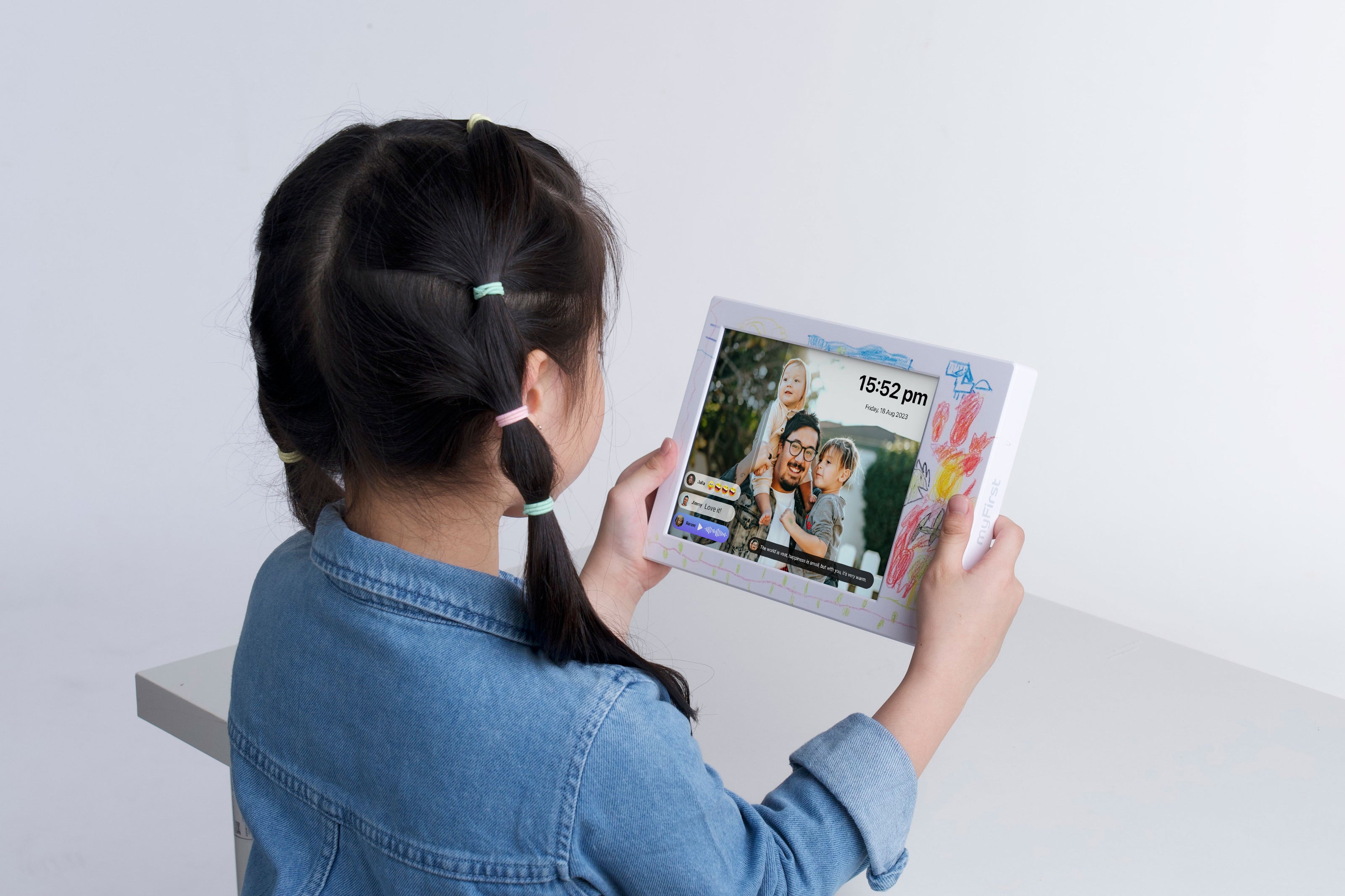Crafted to foster stronger connections among loved ones, the Frame seamlessly synchronizes with other myFirst devices, showcasing a stream of content shared by family and friends.