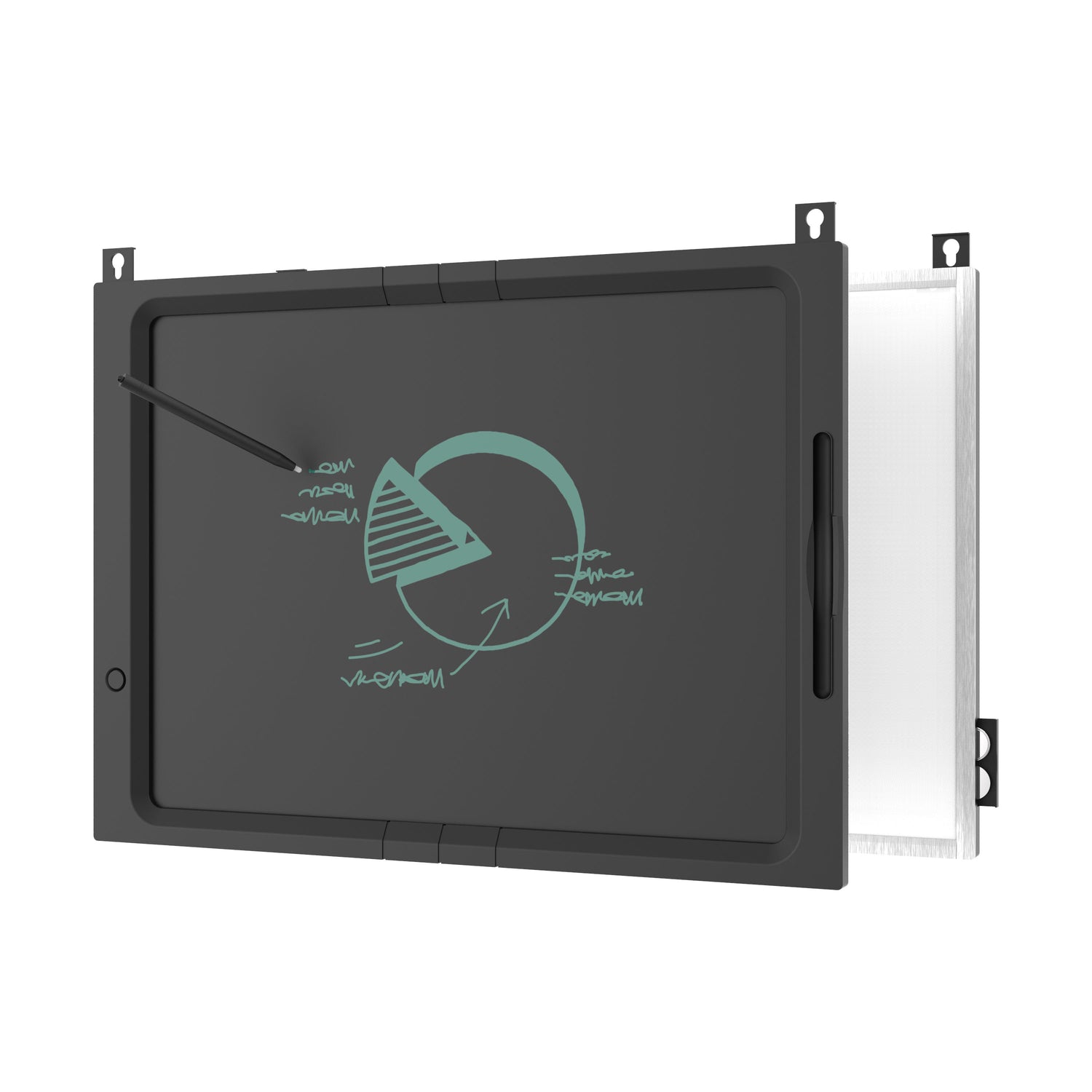 The LCD side clears instantly with a one-key erase button, supporting up to 2 years of battery life or 50,000 erase cycles before needing a battery replacement.
