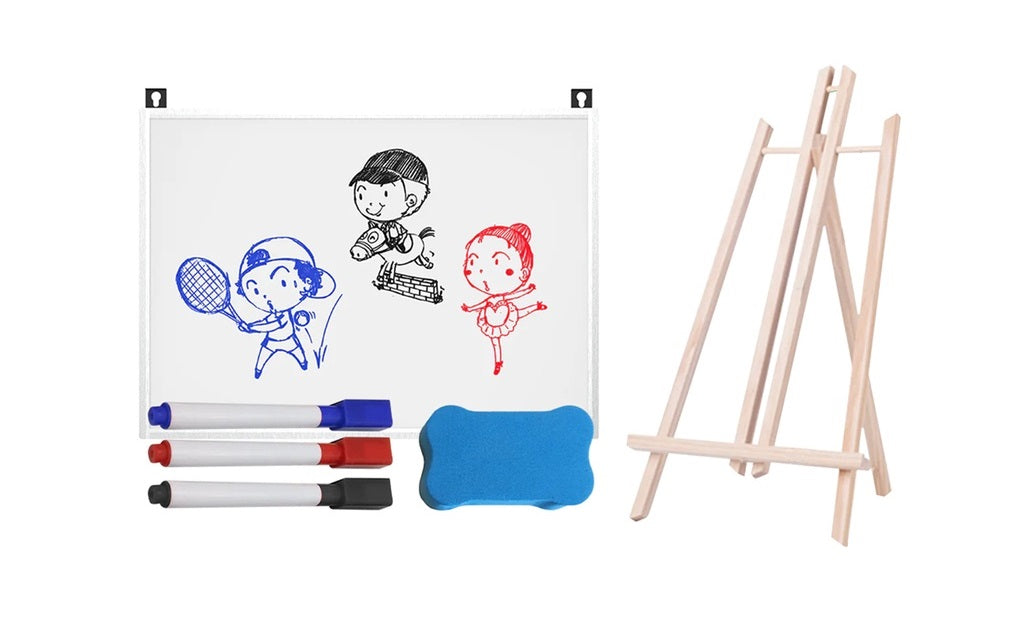 In addition to the sketch board, we've included a whiteboard set comprising three colorful markers, one eraser, and a wooden art easel, providing everything your kids need for writing and drawing.